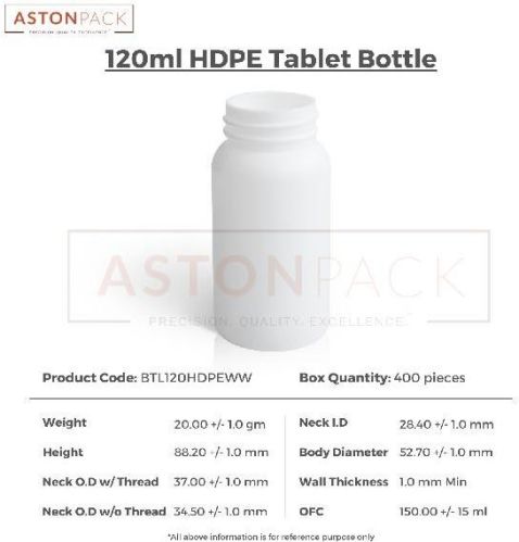Contact SupplierOur 120 ml White HDPE Plastic Round Tablet Bottle has a 38-400 neck finish. This bottle has a wider mouth compared to other normal tablet packaging bottles. Due to its wider mouth, it is easily compatible with automatic filling machines.