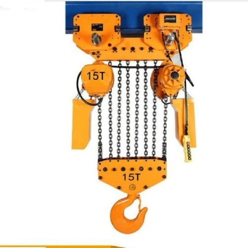 Contact SupplierProduct Description 15 ton electirc chian hoist with schneider contactor Product Description Details of Electric Chain Hoists:1. Electric motor partial outer coverThey are made of high strength aluminum system through compression casting formation.Features: Solid and light, Fast release heat, Continuous use, Enclosed structure. Can be used in the chemical plants, electroplating factories, and other places.2. Side kind brakingThis masterly structure ensure the hoist absolutly safety when the power off. And ensures it is safe when has excess load. Also it combine to the motor braking as the double brake system to strengthen security and durability.3. GearThe gear made of alloy steel and through the heat treatment4. Antiphase protectorAdvatages: When power-supply wiring mistake, the control circuit is unable to move.5. HooksThey are made by hot forging and heat treatment.6. ChainIt is made of FEC80 ultra strong heat treatment alloy steel.Advatages: It is safely approximately when used in the rain water, the sea water, under the chemical and other bad conditions.7. ISO: M4 /FEM: 1AMInsulation grade: F8. Protection class (hosit and push button): IP549. Powder supply: 3 phase, 200-600V, 50Hz10. Noise (single/ double speed): 81dB. Our Product:Our Products includes the following:1, Crane accessories2, Electric hoist3, Single - beam cranes4, Double - beam cranes5, Bridge crane6, Gantry crane7.Lifting equipment and accessories. We supply crane products
