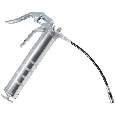Pistol-style grease gun, zinc plated. One-hand operation, with 12 inch flexible hose to reach into tough spots. Uses standard 14 oz. grease cartridge, or can be bulk filled. If a longer hose is needed, see model 176 (18 inch), sold separately.