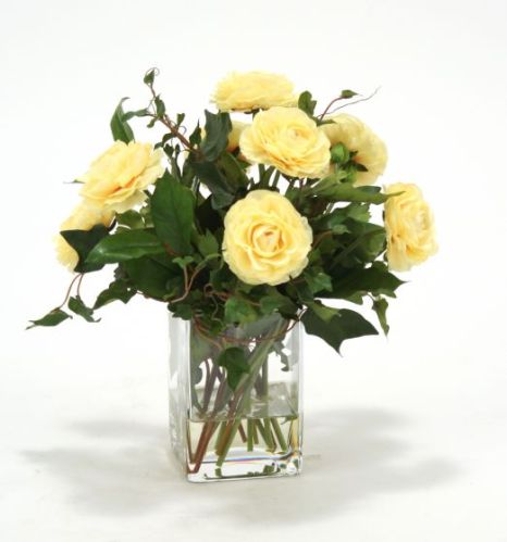 16220# - Waterlook (R) Light Yellow Ranunculus w Ivy and Basil in Square Glass Vase Container Material Glass Dominant Color Buttercream Dominant Color Family Yellows Shipping Weight 5 Ships