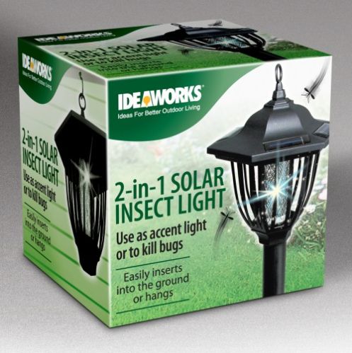 2 IN 1 SOLAR INSECT LIGHT Easily insert into ground or hang from wall or ceiling. Ground stakes & poles included.When assembled with stake and poles, unit is over 20" tall. No plug in cords required. Solar Rechargeable Battery Included. ID JB6593 BRAND IDW-GNO CASE PACK 12 CASE WEIGHT 10.85 CASE LENGTH 19.4 CASE WIDTH 13.6 CONSUMER PACK COLOR BOX CONSUMER PACK DIMENSIONS 6.1 X 6.2 X 6.3 UPC EAN NUMBER 017874009558