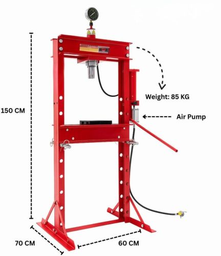 Contact Supplier20 Ton Air Shop Press with Gauge. It is used for straightening, bending, or pressing machine parts. Built in a strong H-frame design, it has a working range of 885 mm. Dimensions: 70 cm length, 60 cm width, and 150 cm height. Weight is 85 kg. The machine is powder-coated for durability. It includes an air pump, which reduces manual labor effort. Ideal for workshops and industrial use.