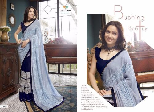 - triveni's fantastic saree collection in fine georgette with charming prints, vivid embroidery & decorative matching lace & borders complemented by art silk blouse pieces. Please contact order. Single available