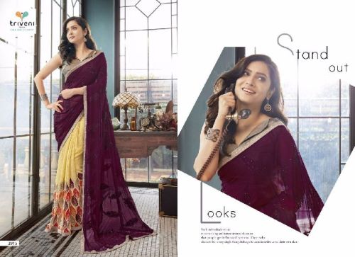 - triveni's fantastic saree collection in fine georgette with charming prints, vivid embroidery & decorative matching lace & borders complemented by art silk blouse pieces. Please contact order. Single available
