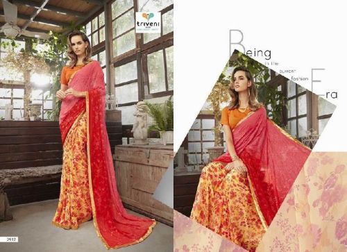 - triveni's fantastic saree collection in fine georgette with charming prints, vivid embroidery & decorative matching lace & borders complemented by art silk blouse pieces. Please contact order. Single available