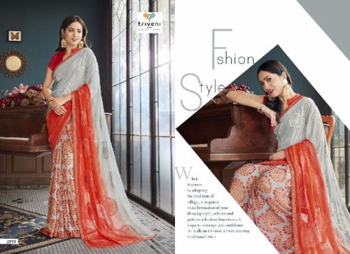 Triveni's fantastic saree collection in fine georgette with charming prints, vivid embroidery & decorative matching lace & borders complemented by art silk blouse pieces. Please contact order. Single available