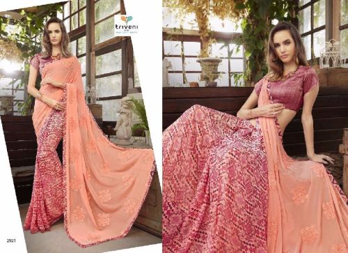 - triveni's fantastic saree collection in fine georgette with charming prints, vivid embroidery & decorative matching lace & borders complemented by art silk blouse pieces. Please contact order. Single available