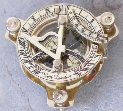 A solid brass sundial compass. Made of brass. This is a beautiful Hampton Nautical solid brass triangle sundial compass. The top of the sundial is hinged and a curved scale is used to set your local latitude angle. Â