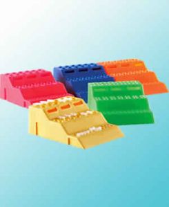 Interlock multiple racks to increase tube storage. The tiered rack makes sample transfer and loading an easier process. Polypropylene racks connect to one another on either end. Finger slots are moulded into the rack making them easy to pick up and move. Lowest level holds individual 0.2 mL tubes or strips of 8 or 12 tubes with 24 wells and well dia 6.3 mm. Middle tier holds 0.5 mL tubes with 14 wells and well dia. 7.8 mm. Top tier holds 1.5 mL tubes with 12 wells and well dia. 11 mm.