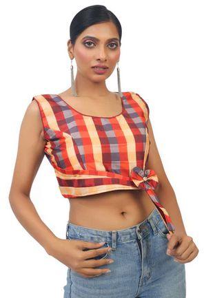 Sleeveless Checked Silk Blouse, Size : 32, 34, 36