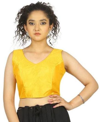 Sleeveless (Sleeves Attached) Yellow Latkan Silk Blouse, Size : 32, 34, 36
