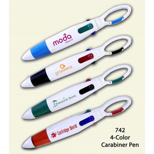 Impress them with this unique 4-Color Carabiner ballpoint pen. Each pen writes in 4 different colors : black, blue, red and green. Elegant and stylish premium quality ballpoint pen with comfort grip in fashionable and popular colors as shown. Our stylish and elegant high quality pens will enhance your image. Perfect for trade shows, sales visits and everyday office use. Eco friendly, materials are 100% recyclable. Length 5.5" approximately. Additional Information Production Time: 3 - 7 days may vary per product please inquire.
