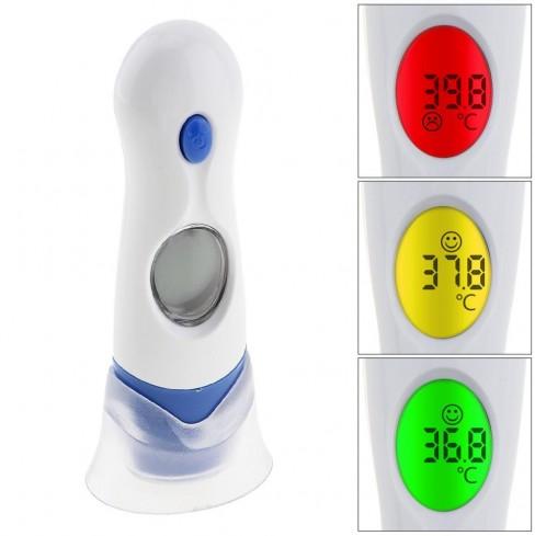 Digitally measures ear, forehead, room temperature and clock