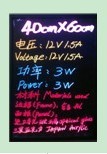 We are offering 40x60cm 12v 3w led writing board. Screen dimension: 40x60cm led: rgb smd 5050 voltage: 12v power: 3w frame: aluminium weight: 2.3kg panel material: glass/polymethy methacrylate application: advertising, products display the price is ex factory price, excluding charge for wooden frame in transportation or wooden case packing cost. The cost of pmma is over usd5.72. Each item of product price increase more usd1.31. We can send a free 1.2 metre wire, a free towel, afree 4mm led fruorescent pen. Country of origin: made in china.