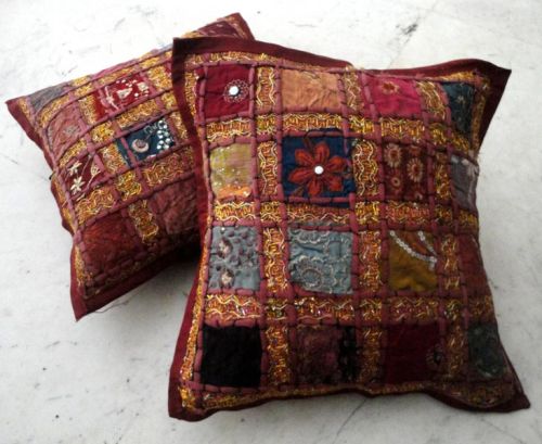 We are offering 5 red embroidered cushion covers. Amazing pair of extensively beaded kundan work vintage red, russet and dark chocolate sari patchwork indian decorative toss throw cushion pillow covers with intricate hand embroidery, moti work and sequin work and copper, pewter & gold embroidery from india. An example of thrilling royal worksmanship - extensive bead work and sequin work arranged in harmonious patterns. These are two very picturesque vintage hand crafted, embroidered pillow covers with a purple base.