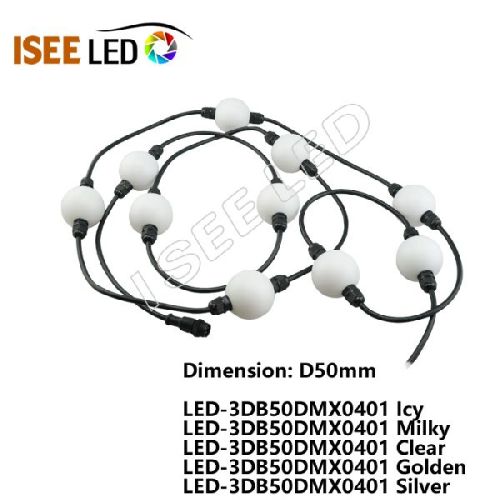 Contact Supplier50MM 3D Effect Curtain String LED Ball Lights   3D LED Ball Lights:  Model No. : LED-3DB50DMX0401  Diameter: 50mm LED Ball Light  Housing Color: Frosted, Clear, Silver, Golden, Icy for your choose  Each piece is 4pcs SMD RGB 5050, DC15V, 1W  Beam Angle: 360 degree  Protocol: DMX512, Manual Setting DMX Address Model NO. LED-3DB50DMX0401 LED-3DB40DMX0401 Housing Diameter 50mm 40mm LED type SMD RGB 5050 SMD RGB 3535 LED QTY 4 Leds 4 Leds Emitting angle 360 degrees 360 degrees Color ■■■RGB full color ■■■RGB full color Gray Scale 256 256 Operating Voltage DC 15V Power MAX=1W Control Protocol DMX512 Control Mode DMX Artnet  DMX DVI  Standalone Control Housing Color FrostedClearSliverGoldenIcy Protection IP 54 IP65 LED Source Life 50,000 hours, based on test data of LED manufacturer Note Pitch and Qty for each string can be customized Photo show of 50MM 3D Effect Curtain String LED Ball Lights Related DMX LED Controller for 50MM 3D Effect