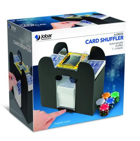 6 DECKS CARD SHUFFLER No more fumbling with a deck of cards. Shuffles cards quickly and thoroughly, so you don’t have to. Fits all standard size cards. Requires 4 C batteries (not included). ID JB7663 BRAND JOB CASE PACK 12 CASE WEIGHT 22.15 CASE LENGTH 18.00 CASE WIDTH 14.90 CONSUMER PACK COLOR BOX CONSUMER PACK DIMENSIONS 8.5 X 4.6 X 7.9 UPC EAN NUMBER 017874021321