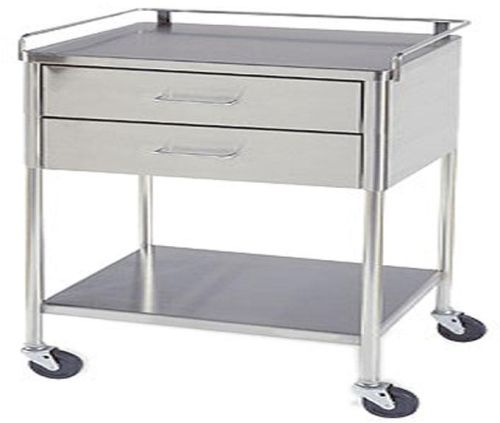 HF2025 - Medicine Trolley, Superior S.S. Standard Features: Trolley made of stainless steel. Size: 640 × 450 × 850 mm. Top surface with 3 side guard railings. 2 S.S. lockable drawers. 1 S.S. Shelf below the drawers. 4 swivel castors (2 with brakes).