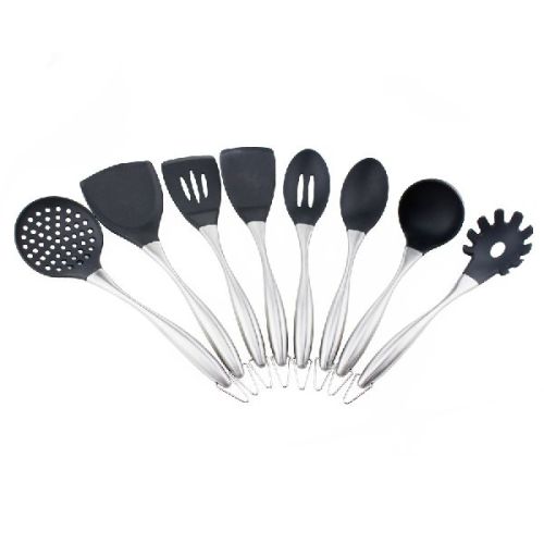 Contact SupplierSilicone Kitchen Utensils 8-Piece Set - For All Your Cooking And Serving Needs. Stylish Multipurpose Utensil Set with Comfortable Stainless Steel Handles and Black Nonstick Silicone Heads. 8 Piece Silicone Kitchen Utensils set Nonstick,Non-Scrath,Heat Resistant Cooking and Serving Spatulas for Pots and Pans-BPA-Free and FDA Approve Complete Cooking Utensils Set Includes Spoon,Turner,Chinese Spatula,Pasta server,Ladle,Strainer. Item name: Kitchen Accessories 8pcs Silicone Cooking Utensils set Material: Silicone+nylon for function part, #430S/S for handle      Size: 1.Skimmer: 33.4x10.4cm; 121g2.Chinese Spatula: 33.6x10cm; 117.5g3.Slottede Spatula: 33.2x7.8cm; 102.5g4.Solid Spatula: 32.6x7.8cm; 107.1g5.Slotted Spoon: 32x6.4cm; 100.8g6.Solid Spoon: 32x6.4cm; 106.3g7.Soup ladle: 28.7x8.5cm; 126g8.Spaghetti Spoon: 31.2x7.7cm; 101.6g Â