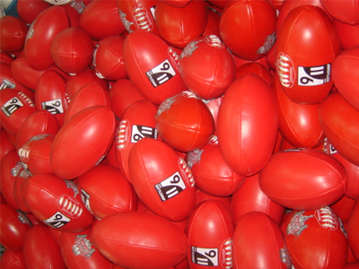 Description Red PVC aussie rules footballs, adult hand stitched, fitted inside best quality latex bladder, mini size.