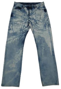 Denim Discharge is used to achieve a white discharge effect on indigo dyed fabrics with reduced health and safety issues with no degradation of the fabric. The activator is Zinc Formaldehyde Sulfoxylate, and this is what causes the dyes in the fabric to be deactivated. Printing a straight discharge ink typically ‘bleaches’ the fabric down to its natural color, a slightly off white. Discharge inks work well on fabric that is dyed with reactive dyes, although some dyes are more resistant than others, often those colors are in the kelly green, purple and royal blue families. When discharged, these resistant fabric dyes yield a more muted print that is usually a lighter tint of the base fabric color.