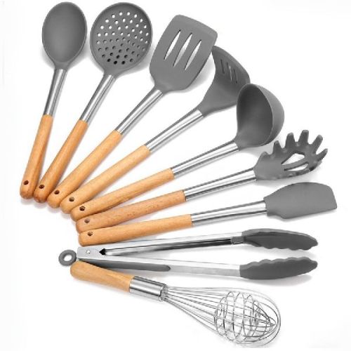 Contact Supplier9PCS Silicone Kitchen Utensils Set Silicone utensils set is food grade, non-toxic, BPA-free and FDA approved; Silicone utensil cooking set is also highly durable and resistant to cold and hot temperatures ranging from -22 Fahrenheit to 392 Fahrenheit, making this set perfectly suited for all your cooking needs COMPLETE MODERN COOKING UTENSILS SET outfit your kitchen with this 9-piece set of stylish silicone and wood cooking utensils; includes silicone spatula, silicone turner, silicone spoon, silicone skimmer, silicone ladle, silicone pasta server,food tong,egg whisk and potato masher. Silicone kitchen utensils upgrade your cooking experience with these beautiful and versatile grey cooking utensils that combine function and form; suitable for all types of cookware; hanging holes help keep your kitchen organized Item name:9PCS Silicone Kitchen Utensil Cooking Set Material:Silicone for function part, stainless steel and wooden handleSize: 1.Solid Spoon:34x7cm,87.3g2.Skimmer:35x10cm,105.3g3.Slotted Spatula:35.5x8,100.9g4.Potato Masher:31.4x7.8cm,100.5g5.Soup Ladle:31.5x8.5cm,106.8g6.Spaghetti Spoon:34x6cm,88.5g7. Scraper:34x5.5cm,89.3g Feature:Food grade Logo:Customized logo MOQ: 1000set Sample time: 3days Production time: 35-40days after pre-production sample approval Package:OPP bag,Color box.etc.