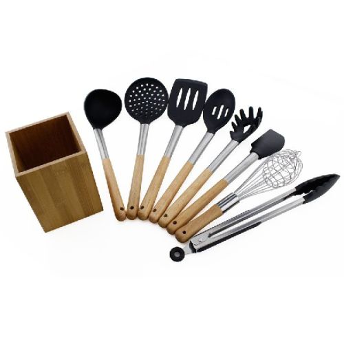 Contact Supplier9PCS Silicone Kitchen Utensils Set Modern and functional design, easy to handle and clean Resistant stainless steel - highly resistant to hardcore cooking Easy storage: handles with hanging loops Pot and pan-friendly silicone heads to protect your cookware (no scratches!) Item name:9PCS Silicone Kitchen Utensil Cooking Set Material:Silicone for function part, stainless steel and wooden handleSize: 1.Solid Spoon:34x7cm,87.3g2.Skimmer:35x10cm,105.3g3.Slotted Spatula:35.5x8,100.9g4.Potato Masher:31.4x7.8cm,100.5g5.Soup Ladle:31.5x8.5cm,106.8g6.Spaghetti Spoon:34x6cm,88.5g7. Scraper:34x5.5cm,89.3g 8.Egg whisk:28x6.5x6.5cm, 63g 9.Holder:11x11x15cm, 280g Feature:Food grade Logo:Customized logo MOQ: 1000set Sample time: 3days Production time: 35-40days after pre-production sample approval Package:OPP bag,Color box.etc.