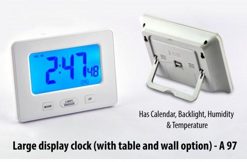 A-97 Large display clock (with table and wall option) It is a 2 in one clock which can be used as both wall clock or table clock. It also shows Calendar, Backlight, Humidity & Temperature.