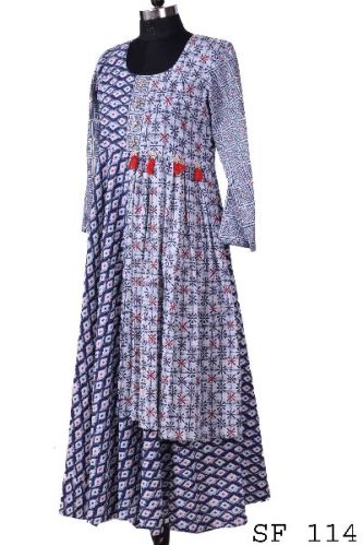 A –Line Sanganeri, fancy long dress with tassels Length-46 To 52 Size-S To XL Product Details:-- Fabric –Cotton Neck- Round Print- Sanganeri Sleeve-Full Features:-- *Beautiful fancy long dress in sanganeri print *Comfortable wear *Easy to care *Breathable cotton *High Quality Stitching and Finishing