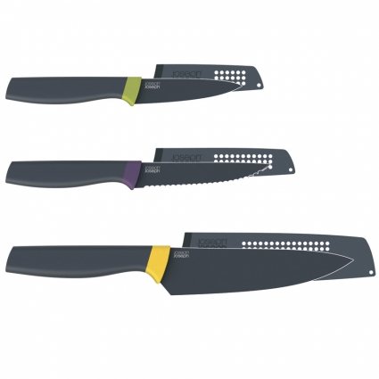 A set of 3 knives designed to minimize the mess that occurs when cooking. Each device is equipped with an innovative heavy-duty handle, thanks to which the stained part of the tool always remains a shed and does not touch the work surface.
