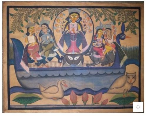 Details Durga is one of the most revered dieties in Hinduism. She is worshipped as a principal aspect of the mother goddess Devi. She is associated with protection, strength, motherhood, destruction and wars. The painting depicts her arrival on earth with her children, Kartik, Ganesh, Lakshmi & Saraswati. Her arrival is the time of festivity & celebration after she destroyed the evil & retained the good.