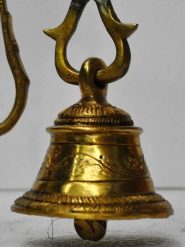 a beautiful brass handmade bell with stylish brass chain.\rin india and across the globe the day in a temple starts with a sound of the bells that are being placed at the entrances.\rthese ringing bells are like a message to the whole world of a new day that starts with a visit to the temple/god making the starts of a day-the new one. A large number of people have started placing these bells at the temple/ place of worship in their homes making it look alike a real temple with bells. We believe that it is an innovative and great way to starts a day by offering prayers in your on comfort zone and at a same time giving a newer look to that sacred place at your home. Our bells have been specially carved to match your likings and deity you believe in. This bells have been specially carved for those who believe all gods/goddesses are one just the name differs.