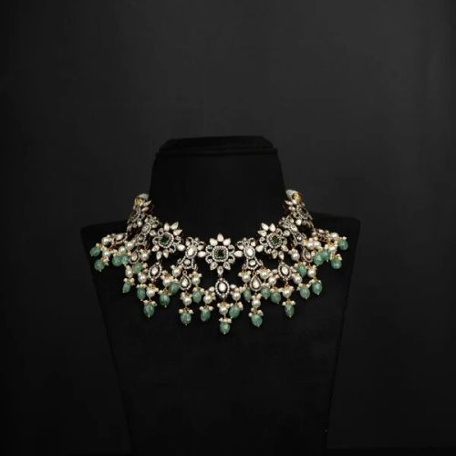 Contact SupplierThe stunning Aarin silver necklace is the perfect accessory for your traditional attire. This necklace is meticulously crafted from premium 92.5 silver with gold plating, and it is elegant and classic. It features timeless tourmaline, cubic zirconia, moissanite, emerald stones, and seed pearls in a gorgeous integrated design. This silver necklace is the ideal addition to your silver jewellery collection.
