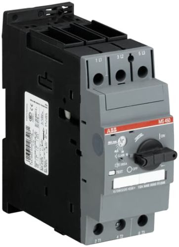 Contact SupplierThe MS450-45 manual motor starter is a 55 mm width devices with a rated operational current of Ie = 45.0 A. This device is used to manually switch on and off motors and to protect them reliably and without the need for a fuse from short-circuits, overload and phase failures. The manual motor starter offers a rated service short-circuit breaking capacity Ics = 25 kA at 400 VAC and the trip class 10. Further features are the buildin disconnect function, temperature compensation, trip-free mechanism and a rotary handle with a clear switch position indication. The manual motor starter is suitable for three- and single-phase applications. The handle is lockable to protect against unauthorized changes. Auxiliary contacts, signalling contacts, undervoltage releases, shunt trips, 3-phase bus bars, power in-feed blocks are available as accessory