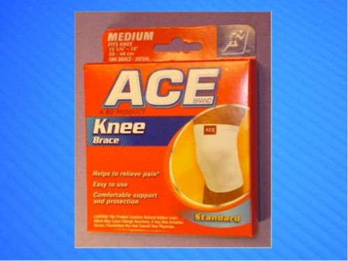 Elastic tubular knee brace for strapping comfort. Available from many supermarkets or online drug stores. There are fancy ones at sport or drug stores with side bracing or holes for the patella. We don’t need all that.