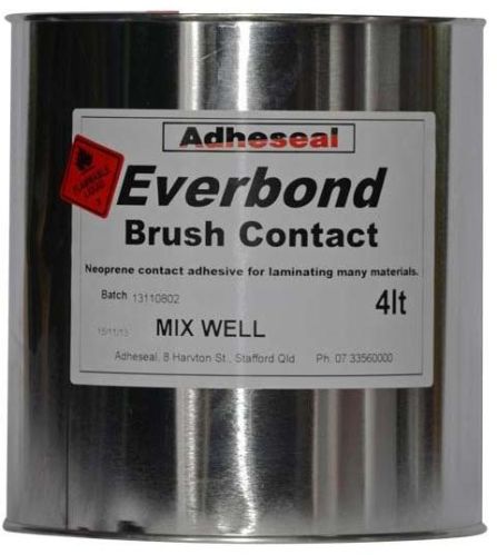 Everbond contact adhesive has been designed specifically for use in the kitchen, shop-fitting and construction industries for the bonding of a wide range of porous and non-porous materials such as metals, laminated plastics, plywood, particleboard and mdf board without the need for clamps or presses. Everbond brush contact adhesive is a medium viscosity, general purpose construction grade product suitable for use with a brush or scraper.