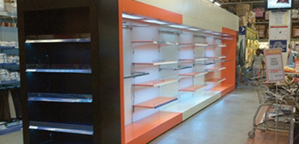 Customized modular centre display unit with adjustable shelves.Customized ACP wrapped double sided display unit with provision for adjustable shelves, front side face hanging with LED lights for each shelvesustomized central display unit with provision for shelves, front side face hanging.
