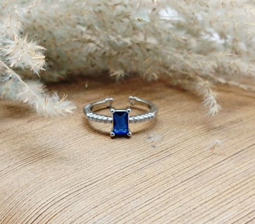 Add a pop of sparkle to your everyday look with this elegant adjustable silver-tone ring, designed for women who love modern, minimalist jewelry. The ring features a striking rectangular blue simulated sapphire stone as its centerpiece —crafted to mimic the deep, rich color of a natural gem.Complementing the bold blue stone are small clear rhinestones delicately set along the band, adding just the right touch of shimmer. The open band design is finished with heart-shaped accents, giving it a romantic flair while allowing the ring to flexibly adjust for a comfortable fit on most finger sizes.Made from durable, silver-toned alloy, this ring is nickel-free and lead-free, making it safe for sensitive skin. Whether you're dressing up or keeping it casual, this piece adds effortless style to any outfit.