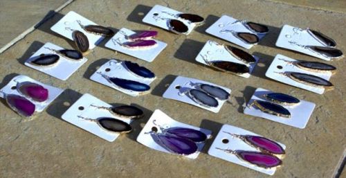 We are offering agate slices earrings plated. agate slices earrings plated handmade in the south of brazil! * colors: black, blue, green, natural, pink, purple, red and teal * large stock available * we offer very cheap shipping and low moq * we accept paypal!