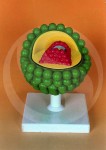 HIV virus model is enlarged millions of times, shows the outer lipid membrane with protein structures and the internal nucleus which contains the viral hereditary matter [RNA]. The nucleus is removable and condoms can be put underneath to provide a message regarding measures to be taken for protecting against HIV infections. Supplied without condoms, on stand, with key card.