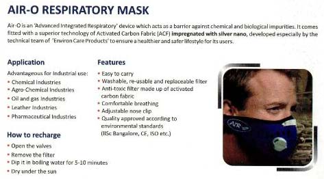 We are offering air-o respiratory mask. *easy to carry *washable,re-usable and replaceable filter *anti-toxic filter made up of activated carbon fabric *comfortable breathing *adjustable nose clip *quality approved according to environmental standards.