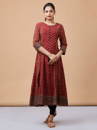 Contact SupplierMaroon ajrakh hand block printed cotton kurta with band collar, ajrakh piping detailing, potli button detailis at the placket, side slits and quarter sleeves.
