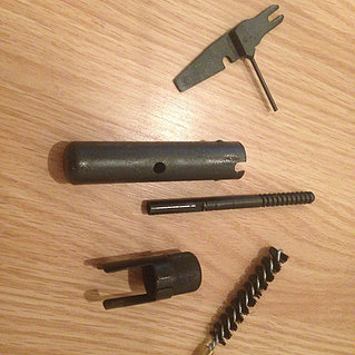 SKS AK buttstock cleaning kit. Includes Jag, Brush, and the tool you see pictured, which acts as a sight adjustment tool, handle, punch, all in one! Works with the cleaning rod, great for keeping your rifle in tip top shape, thanks for looking!