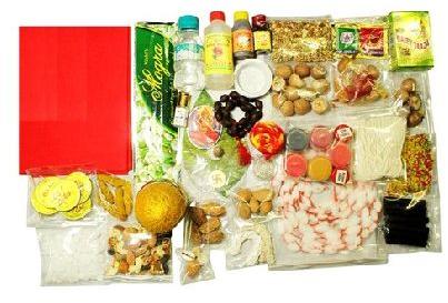supari , lawang, roli , rice , chandan , haldi powder , haldi gath , mishri , sugar, janeu, paan ke patta , mango leaves , dhoop , kapoor , ghee , batti (round) , batti (long) , deepak , matchbox , agarbatti , red cloth , nariyal , dhurwa grass , tulsi leaves , kesar, panchmeva , elaichi , donaplastic container , moli , itra , abheer gulal , wheat , honey , peeli sarson , ramayan book , aasan