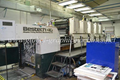 We are offering akiyama bestech printing press. Ref. 3555 - akiyama bestech 540 - age 1992. 5 color straight press; max. Size: 720 x 1020 mm (28.3 x 40.2 inches); alcohol dampening; akiyama control console; baldwin refrigeration and recirculation; double sheet control; non stop in feeder and delivery; 117 mio.