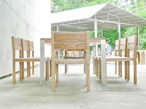 Contact SupplierConsists of zapatista dining table and 2 alex dining arm chairs & 6 alex dining side chairs in handgraded solid reclaimed teak. form and function. Top 3 inch thick, legs v cut then bent 90 degrees, satin finished solid stainless steel. dimensions : table : width 210 cm, depth 110 cm, height 75 cm. Armchair : width 54 cm, depth 56 cm, height 85 cm. Sidechair : width 50 cm, depth 56 cm, height 85 cm. Material : handgraded grade a solid reclaimed teak, please see http:store.indochine-decor.comproductionfacilitiesmaterialsoptionsmaterialsreclaimedsolidteak & jis 304 (japanese industrial standard) solid stainless steel.