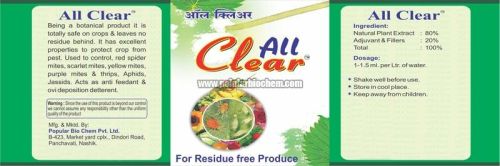 Contact SupplierThe Pesticide (All Clear), which we offer, being a botanical product is totally safe on crops and leaves no residue behind. The Pesticide (All Clear) has excellent properties to protect crop from pest. Used to control red spider mites, scarlet mites, yellow mites, purple mites, thrips, aphids, jassids, Pesticide (All Clear) is processed using the best quality chemicals. Our Pesticide (All Clear) also acts as antifeedant and oviposition deposition deterrent. We are dependable Manufacturer, Supplier and Exporter of Pesticide (All Clear) from Nasik. IngredientsDosage : 1-1.5 ml. per liter of water Precautions