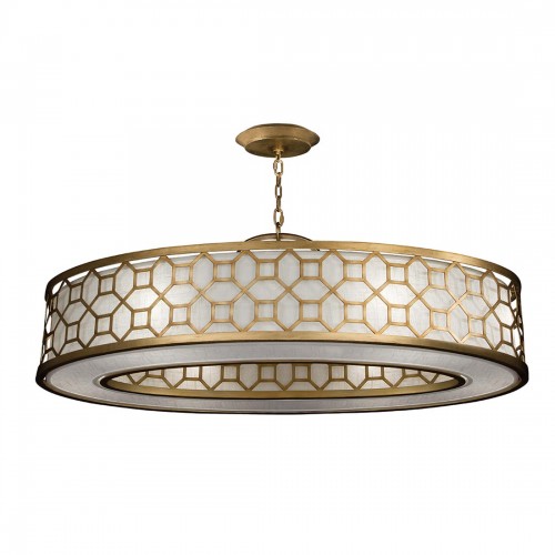 Oval shaped pendant in a platinized silver leaf finish with subtle brown highlights and white textured linen shade.