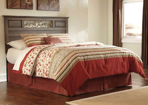 One look at this panel headboard, and you can appreciate the appeal of vintage-inspired style. The rough saw finish is enhanced with a subtle stain that gives the beauty of replicated oak grain its full due. More rustic elements are incorporated through a wonderful vine insert with naturally beautiful flow.