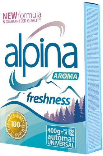 We are offering alpina aroma freshness washing powder. High quality washing powder for white fabrics and linen. High quality carton pack. Strong fragrance (aroma series). Net weight 0.4kg. For automatic washing. Activity